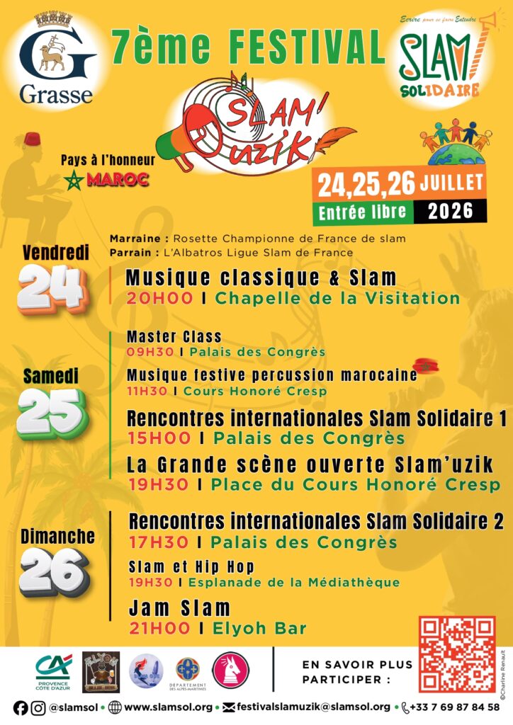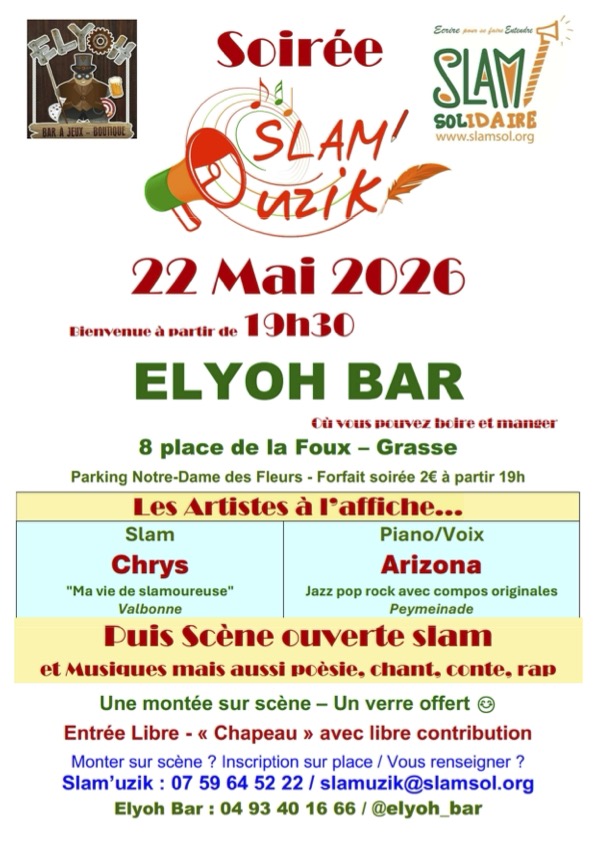 19juin19h30Soirée Slam'uzik Elyoh BarDernière soirée Slam'uzik de la saison avant le 7ème Festival Slam'uzik Grasse du 24 au 26 juillet 2026