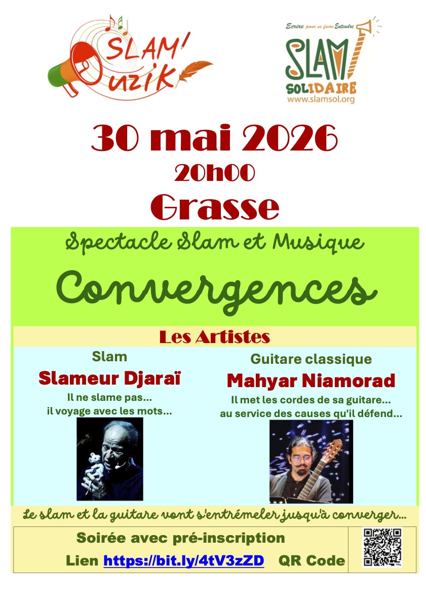 30mai19h30Soirée Spéciale ConvergenceLes slams de Slameur Djaraï et la guitare de Mahyar Niamorad vont s'entremêler